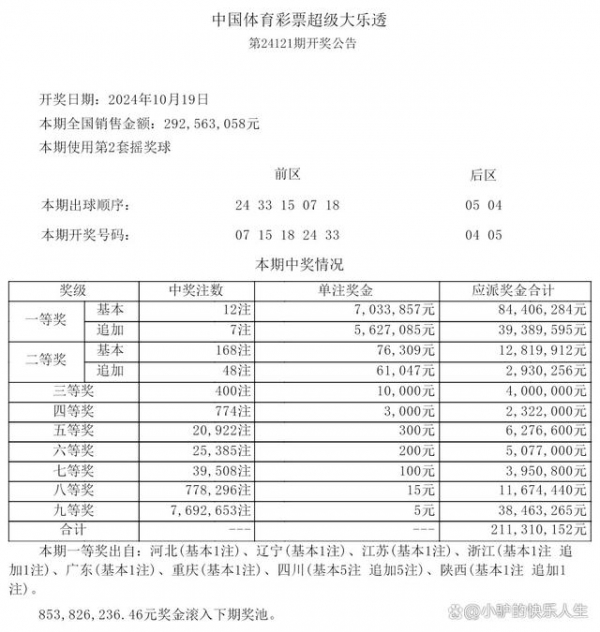 24121期大乐透开奖:一等奖井喷12注,四川独揽5注,奖金6330万。