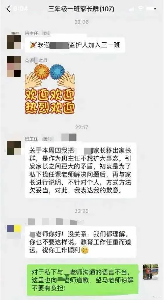 在媒体一报道,班主任和英语老师赶紧道歉,承认自己处理问题不合适,28号晚上又把家长拉回了群里。