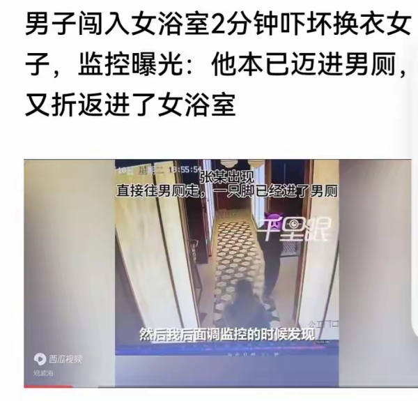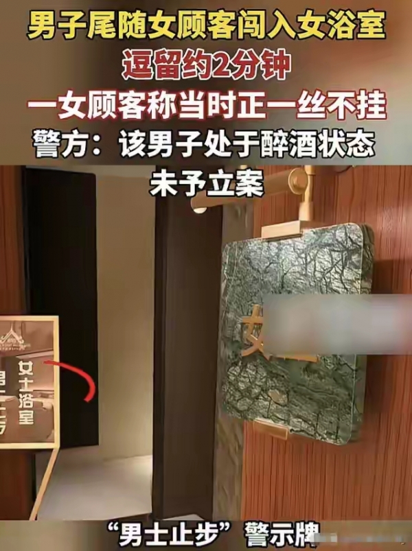 男子本已走到男浴室门口,脚都迈进男厕,却突然停下鬼祟张望;看到女顾客进入女浴室,立刻掉头尾随,趁推门间隙钻了进去。路线清晰、动作利落、脚步平稳,完全是蓄意闯入,门口"男士止步"的警示牌形同虚设。