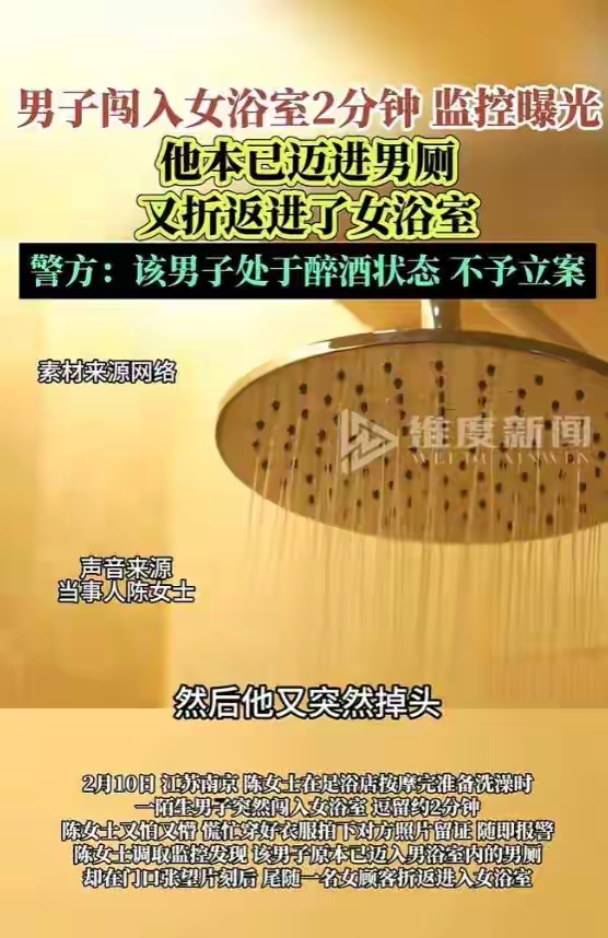 近日,南京一足浴店发生的男子故意闯入女浴室事件持续发酵,受害者陈女士全裸被偷窥、驱赶无效,警方却以"醉酒、无主观恶意"不予立案,监控还原的真相与处理结果形成强烈反差,网友彻底炸锅。