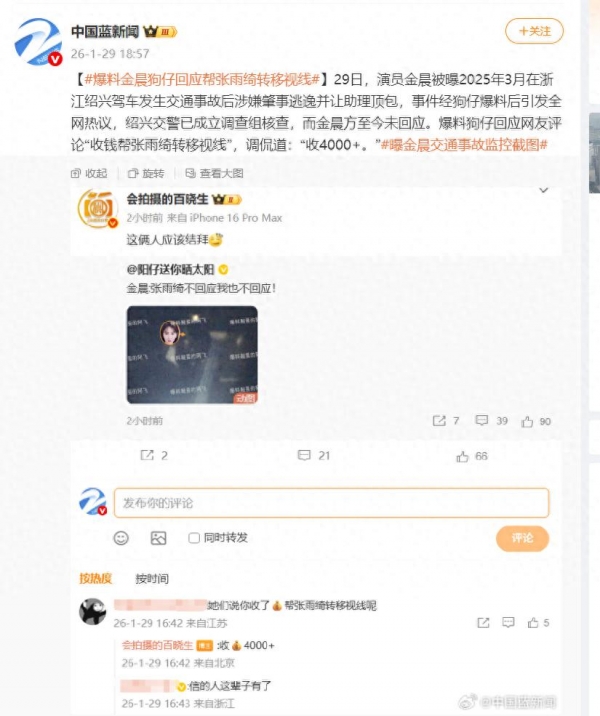 据中国蓝新闻称,爆料狗仔回应网友评论"收钱帮张雨绮转移视线",调侃道:"收4000+。"