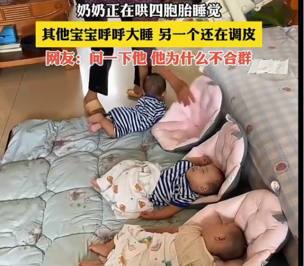 奶奶正在哄四胞胎睡觉,其他宝宝呼呼大睡另一个还在调皮,网友:问一下他,他为什么不合群。