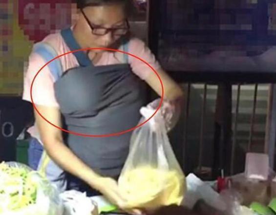 其实一开始的时候,很多顾客都没有注意到她这个与众不同的"布袋",直到一个年轻的顾客不经意地瞄了一眼,才发现布袋里面是一个幼小的婴儿在安然入睡。