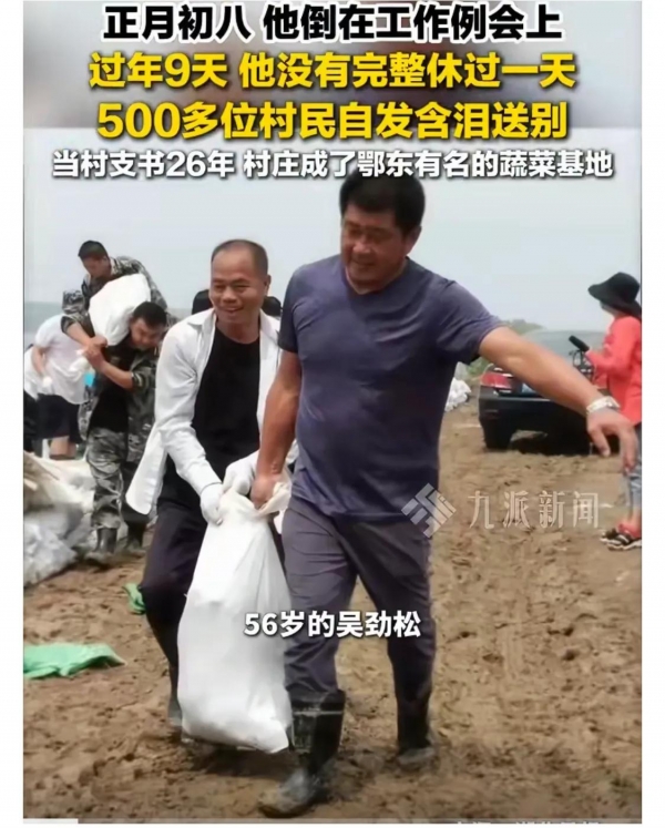 "金杯银杯,不如群众的口碑;金奖银奖,不如老百姓夸奖。"这是湖北黄冈黄州区堵城镇外岭村原党总支书记吴劲松常挂在嘴边的话。2月26日,正月初八,56岁的他倒在了春节后的第一次工作例会上,生命永远定格在他钟爱的岗位上。而在距会场6公里外的黄州殡仪馆,500多名村民自发排起长队,含着热泪送他最后一程,队伍里有他帮扶过的病号、招进村的企业老板……这一幕,是对他26年村支书生涯最真挚的"口碑"。