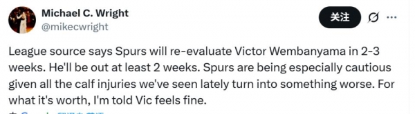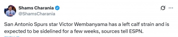 "联盟消息人士透露,马刺队将在两到三周后重新评估文班亚马的伤情,他至少会休战两周。鉴于近期有多起小腿伤势后续恶化的情况出现,马刺队此次处理格外谨慎。另外说句供参考的话,据称文班亚马本人感觉并无大碍。"
