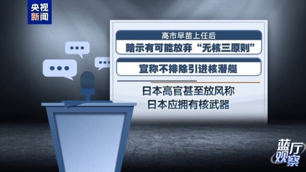 但近年来日本不断寻求强化延伸威慑安全承诺,甚至谋求实现核共享。高市早苗上任后更暗示有可能放弃"无核三原则",宣称不排除引进核潜艇,日本高官甚至放风称日本应拥有核武器。