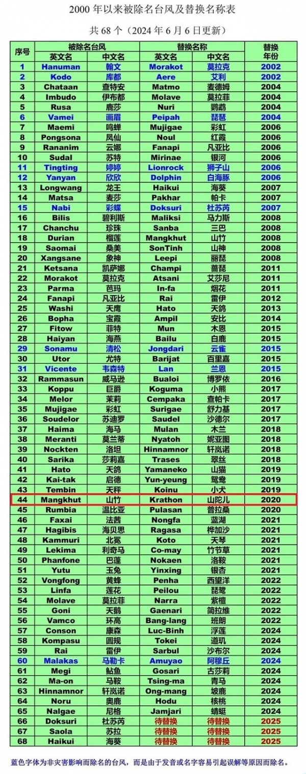 根据命名规则,当某个台风因造成特别重大的灾害或造成人员伤亡而"声名狼藉"时,为了防止它与以后的台风同名,台风委员会会员可申请将其从命名表中删去。被删除后空缺的名称,由原提供国或地区重新推荐。例如,台风"山竹"正是因为造成巨大损失而被除名,它的替换名称就是"山陀儿"。