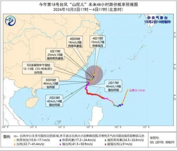 今年第18号台风"山陀儿"(强台风级)的中心2日下午5点位于台湾高雄市附近的海面上,中心附近最大风力达14级(45米/秒)。"山陀儿"10月3日凌晨至中午在台湾岛西南部沿海登陆(台风级,12-13级,33-40米/秒)。
