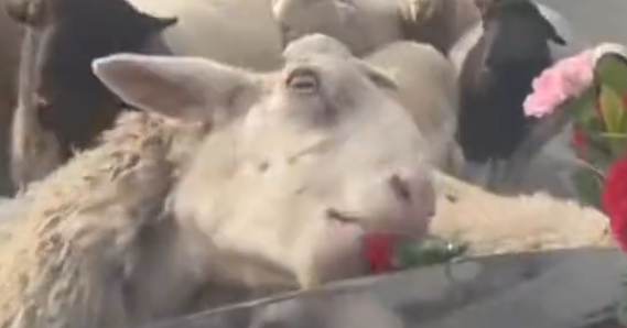 这一幕可把周围的人都看乐了,好在小羊只是啃了一朵花,车辆丝毫没有受损,没过多久,看管羊群的老人就赶紧过来,把羊群及时赶走了,整个过程有惊无险,全是欢乐的氛围。拍摄视频的人也说,这画面看着特别有趣,一点都不闹心,反而给婚礼添了不一样的乐趣。