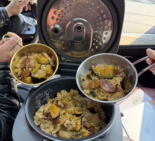 这已经是他们第三年带焖饭上高速,比起往年啃干面包的日子,现在随时能吃上热乎家常味,丈夫直呼比服务区快餐幸福。