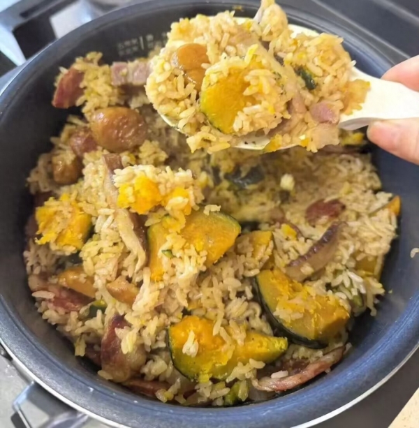 2026年春运期间,浙江的黄女士和丈夫自驾回安徽老家,提前焖了一锅南瓜板栗香肠饭。