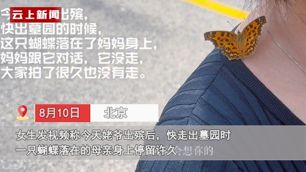 8月10日,北京,女生发视频称今天姥爷出殡后,快走出墓园时,一只蝴蝶落在的母亲身上停留许久。视频中蝴蝶一直停留在母亲的肩膀上,女生用手靠近,蝴蝶也没飞走,一家人上车后也不愿离去。