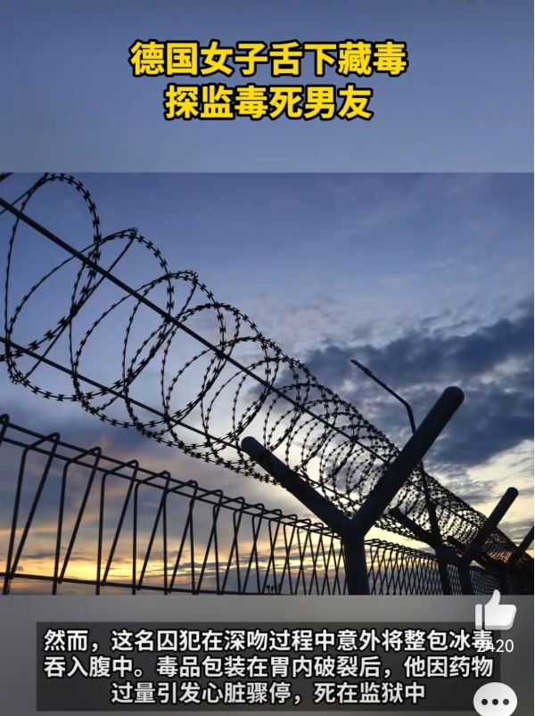 今年1月,德国莱比锡监狱一名23岁囚犯在与女友探视时,通过接吻接收对方藏于口中的毒品,却不慎吞下整包冰毒,导致急性中毒死亡。12月18日,其女友因"故意提供毒品而过失致人死亡"出庭受审,案件引发广泛关注。