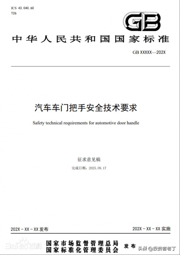 拆开来看,主要有几条硬性要求,这是条强制性国家标准!适用范围包括M1类乘用车、N1类轻型货车和多用途货车的车门把手,其他车型可参照执行。实施日期:2027年1月1日。