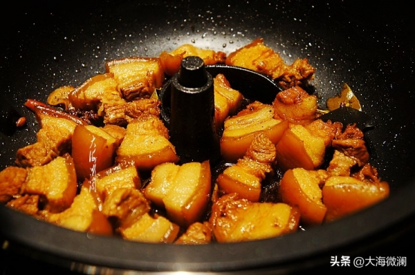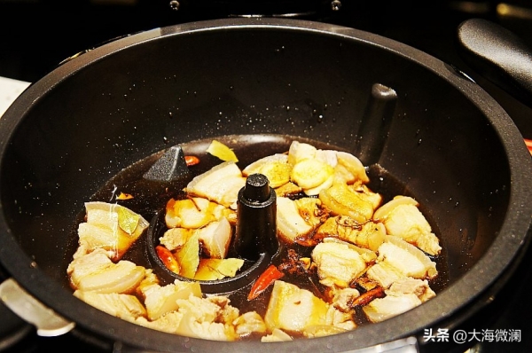 炒菜机,倒入五花肉和所有调味料。加入老抽、生抽和料酒,翻炒出油。加入适量的水,水位与五花肉平齐就好。