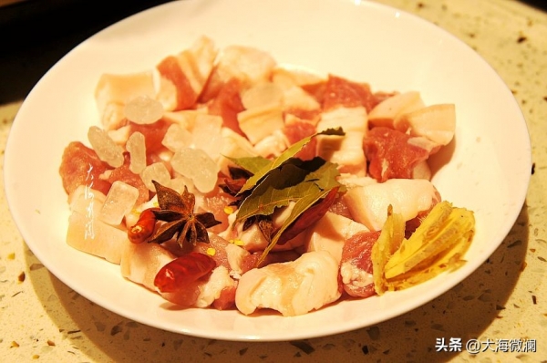 食材:五花肉、老抽、生抽、八角、花椒粒、香叶、姜、冰糖、料酒、小米辣各适量。