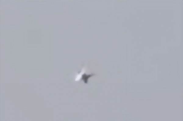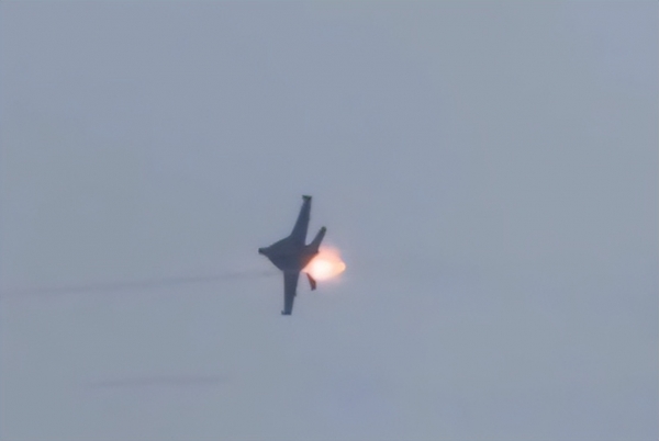 紧接着,机尾处火光乍现,熊熊烈焰顷刻间将引擎喷口附近吞噬。随即,部分碎片自机身脱落,如流星般划过天际,最终坠入浩渺大海。尽管这架飞机并未当场坠毁,而是凭借机体结构和飞行员的操控努力维持飞行状态,但其受损情况显而易见。