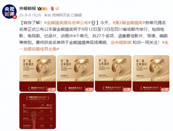 就在昨天,央视发文金熊猫奖奖项提名。