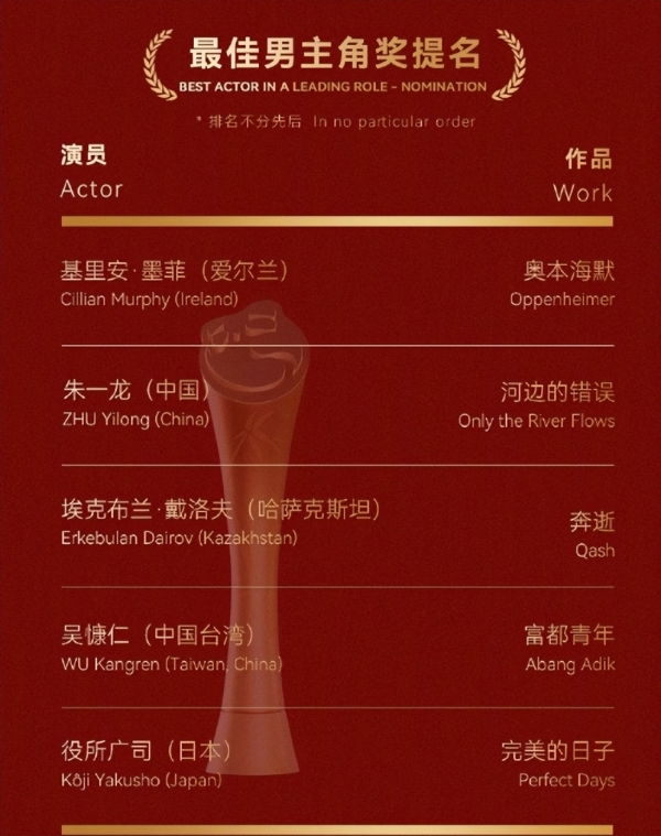 37岁朱一龙凭借《河边的错误》被提名最佳男主角奖。