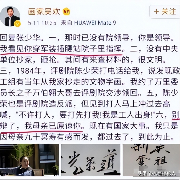 2017年,一条突如其来的动态,彻底打乱了张少华的晚年生活,在社交平台上,画家吴欢公布的消息,丝毫不留情面地给张少华的口碑,来了"一记重锤"。