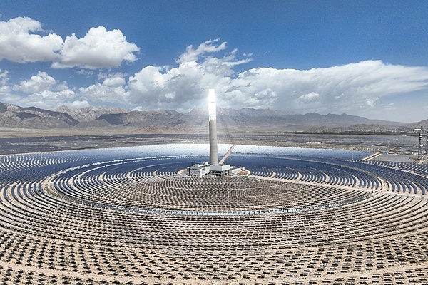 青海海西州,航拍德令哈熔盐塔式光热电站,阳光照耀下熠熠生辉。 视觉中国