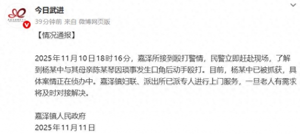 2025年11月10日18时16分,嘉泽所接到殴打警情,民警立即赶赴现场,了解到杨某中与其母亲陈某琴因琐事发生口角后动手殴打。