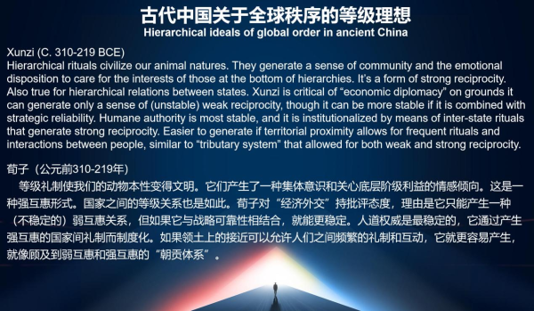 那么今天,我们有没有可能重新建立类似的秩序?尤其在东亚地区,这并不容易。我本人的专业是政治哲学,我认为最伟大的政治哲学家是战国时代的荀子。他系统地阐述了儒家思想,尤其著名的是"性恶论",即人性本有恶的倾向,容易做坏事,但他认为人是可以通过修养改善的。