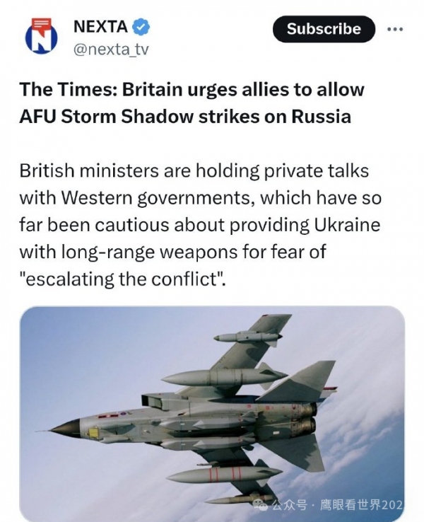 美国这边很可能要援助乌克兰JASSM巡航导弹,作为援乌急先锋,英国也不甘落后。据《泰晤士报》报道,英国政府正在私下敦促盟国解除相关使用限制,允许乌克兰军队使用"风暴阴影"巡航导弹打击俄罗斯境内目标。