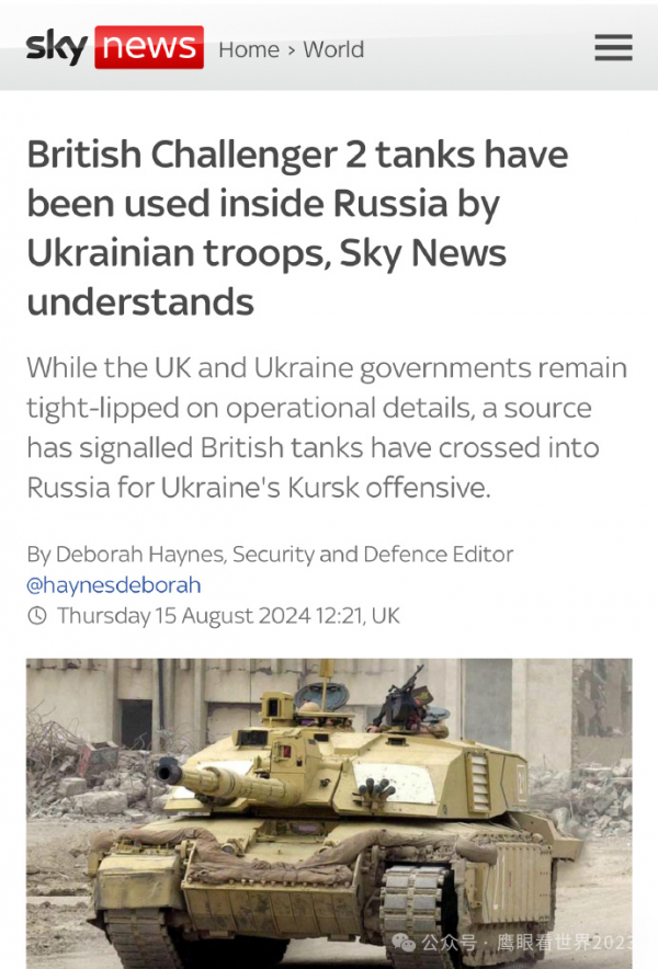 攻入库尔斯克的乌军使用了大量西方武器,其中就包括法国援助给乌克兰的VAB装甲车等武器;至于英国和美国等国援助的武器就更多了,"天空新闻"报道称攻入库尔斯克的乌军很可能使用了英国"挑战者2"主战坦克,网络上也出现了据称俄军在库尔斯克使用"柳叶刀"巡飞弹击毁"挑战者2"主战坦克的视频,不过该视频的真实性存疑,有分析人士认为这段视频很可能是有人用此前视频剪接而成,截至目前,我们尚未看到任何可以证明乌军在库尔斯克使用"挑战者2"主战坦克的确切证据。