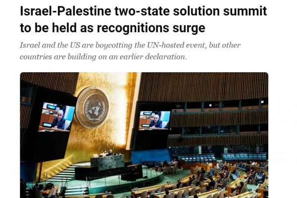 就多个西方国家计划在联合国大会召开期间承认巴勒斯坦国,美国白宫新闻秘书莱维特日前表示,美国总统特朗普就此对这些国家领导人表示不满。另外,美国方面表示,将不参加于22日举办的联合国和平解决巴勒斯坦问题和落实"两国方案"高级别国际会议。