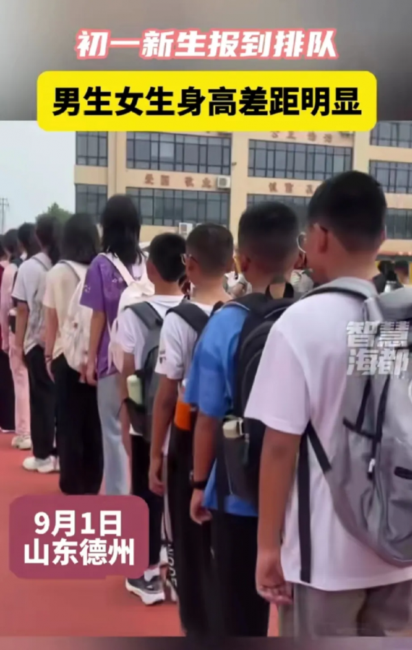 9月1号山东德州初一报道,女生比男生普遍高一大截,男生只到女生肩膀,评论区貌似说的有理,用女生最高的和男生最矮的比,但其实女生平均身高高过男生是肯定的,这个年龄段女生抢先起跑,男的估计要初三才开始追。