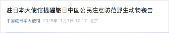 微信公众号"中国驻日本大使馆"11月7日消息,驻日本大使馆提醒旅日中国公民注意防范野生动物袭击,全文如下: