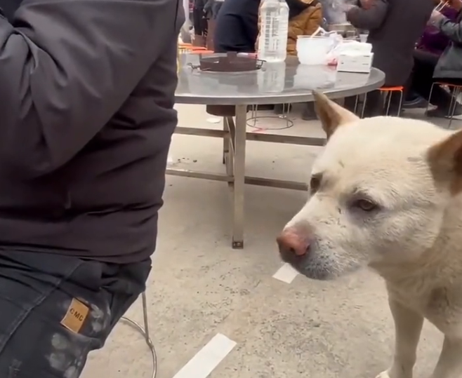 当有亲朋好友在村子里摆宴席时,狗狗的主人便带着它一起去吃席。但由于主人聊的太投入,根本忘记了它的存在。于是它就动手去扒拉主人的裤子,这下主人才想起来给它丢下一些吃的。而且看它主人裤子上的脚印,就能看出狗狗已经扒拉了很多次了。也不知道是狗狗吃的太快,还是主人太过忘我了。