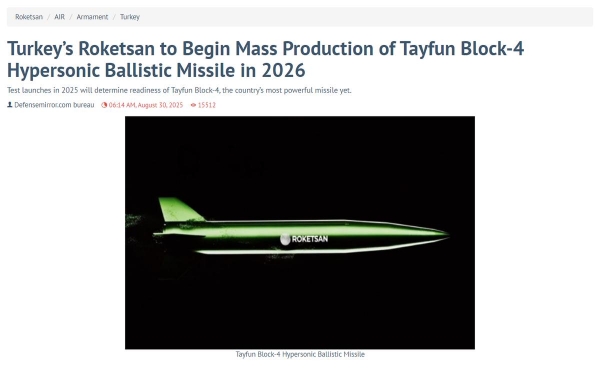 近日,土耳其国防企业罗克桑公司(Roketsan)总经理穆拉特·伊金奇对外高调宣布,土耳其自主研发的"高超音速导弹""台风-4"(TAYFUN Block-4),将在今年完成一系列关键测试后,于2026年正式进入量产阶段。