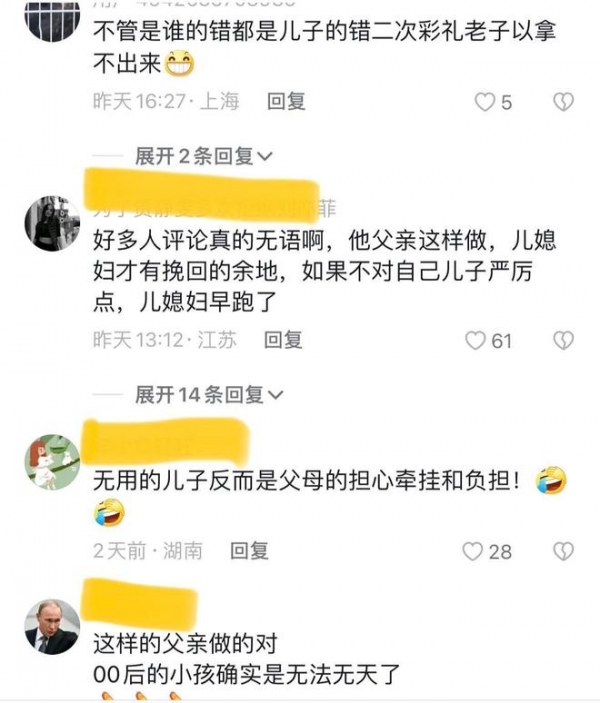 对此,网友议论纷纷,有网友说,看似在骂儿子,实际是在帮儿子。家里有个这么明辨是非的公公,夫妻之间会少了很多矛盾。现在这社会,娶个媳妇彩礼那么多,组建一个家多么不容易啊,还是好好珍惜吧。