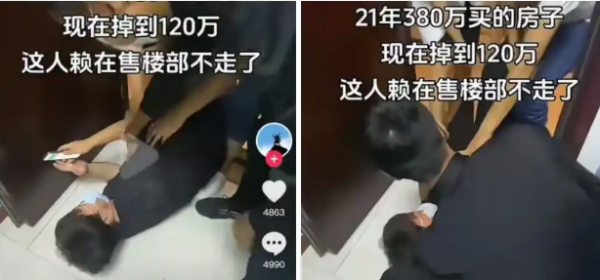 "我就不走!380万的房子怎么掉价到120万了?"22日,浙江一男子跑到售楼部躺下不走,怎么劝都不起来。理由是他380万买的房子,现在跌到了120万。