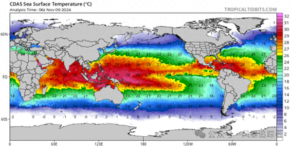 进入11月后,太阳直射点位于赤道以南,热带低纬度洋面受辐射影响,吸收了更多的太阳能量,以至于热带低纬度洋面的海洋表层水温依旧偏高。全球实况海洋表层水温图显示,北印度洋的孟加拉湾,南海和西北太平洋,北大西洋的加勒比海、墨西哥湾,依旧有着大片红色的高水温海域,温度高达29℃以上,标志着这里的海洋能量充沛,以利于热带风暴(台风或飓风)的发展和增强。这几天,西北太平洋22号大台风银杏和北大西洋大飓风拉斐尔一东一西共舞就是明证。