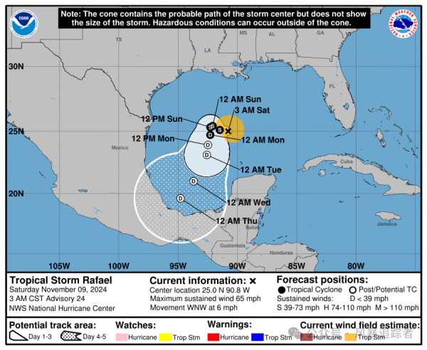 实况数据显示,9日晚间银杏的风速就再次增强到52米每秒了,也就是16级超强台风级,10日凌晨维持着这个数据。CMA预报图显示,超强台风银杏即将开启最后一次大转向,西行转西南行,然后12日晚间再次登陆越南南部。与此同时,10日凌晨,墨西哥湾的16级风暴拉斐尔又西行大段距离了,同时风速也暴跌到50KT,也就是25.6米每秒,即风力10级,强热带风暴级。前后对比,拉斐尔风力大降6级,NHC预报路径,也马上开启直角大转弯,西行变为南下。