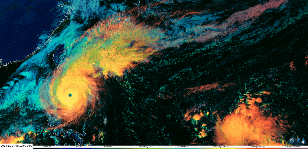 中心风速数据显示,它最高达到了105Kt,比上一波的100Kt都强,换算下就是53.8米每秒,风力16级,超强台风级。这下我们确定了,11月全球第二个16级风暴又诞生了。而第一个16级超强台风,自然要属于22号台风银杏,它早在7日凌晨就达到了,而且风速还是55米每秒,风力近17级。到了7日14时风速更是提升到了62米每秒,成为17级以上的超强台风,晚间登陆菲律宾后,减弱到16级超强台风。而从全球洋面看,"双16级超强台风"共舞开启。