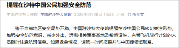 微信公众号"中国驻沙特大使馆"2月28日14时33分发布消息,提醒在沙特中国公民加强安全防范。