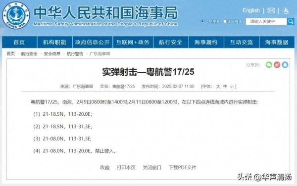 同时,清澜海事局发布航行警告,琼航警11/25,南海,自2025年2月11日至13日,每日1700时至1900时,在以19-37.12N 110-57.32E为中心,6海里为半径的圆形区域内进行军事训练,禁止驶入。