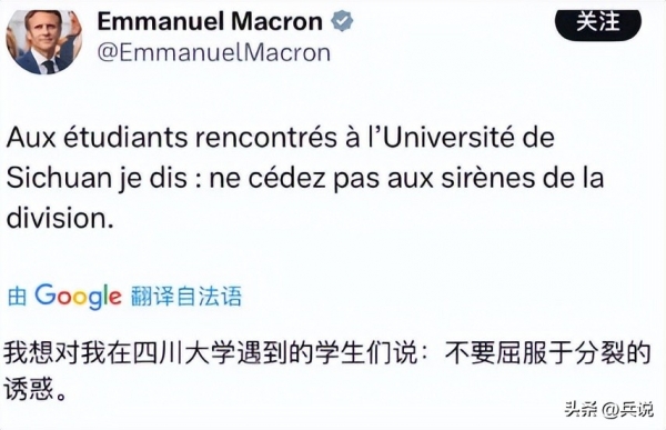 当天在四川大学演讲结束之后,马克龙在个人社交平台上用法语发表一则消息:"我想对我在四川大学遇到的学生们说,不要屈服于分裂的诱惑"。这句话也引发了外界热议,有政策人士解读认为,马克龙想传递的信号是"呼吁团结"。因为当下在法国分裂主义造成的影响愈发明显;法国左右翼之间的博弈、支持移民和反对移民的互搏、社会福利政策削减的争议以及宗教问题等等,已经导致法国政坛乱象丛生,社会上也经常爆发罢工和混乱。所以"拒绝分裂"不仅是经验,对于法国来说更是教训。不过也有声音认为,马克龙倡导的是在国际问题上的合作,各大国、经济体之间必须保持密切的联系,防止分裂和误判发生。