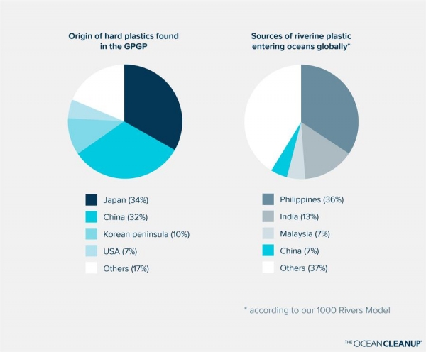 北太平洋垃圾带塑料垃圾国别来源示意图。图片来源:Ocean Cleanup网站。