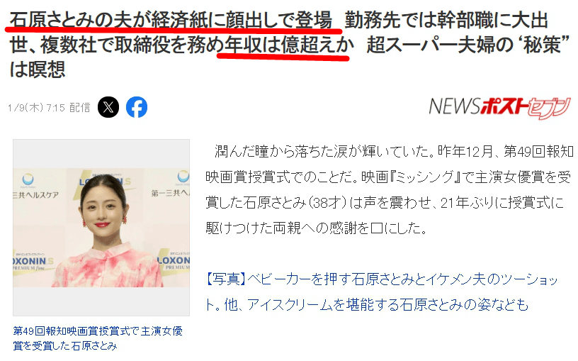 日本媒体确认,石原里美的丈夫名为糸(sī)木悠,他是全球金融投资公司"高盛"日本区域的MD(董事总经理),年薪至少一亿日元(约合465万元人民币)。