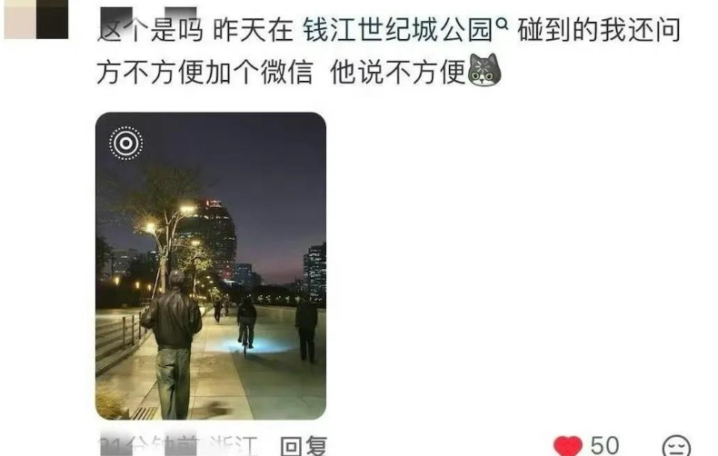 事情要从一个惬意的周末午后说起。杭州钱江世纪城公园的秋阳正好,落叶铺成金色小径,女生趁着好天气来公园散步透气。就在她慢悠悠逛到湖边时,一个身影突然闯入视线:男生戴着黑色鸭舌帽,帽檐压得略低,遮住了大半张脸,身上穿的是简单的休闲外套配牛仔裤,典型的"男友风"穿搭,却凭着挺拔的身形和干净的气质,在人群中格外显眼。女生后来回忆说,当时完全没往明星方向想,只觉得"这帅哥气质也太绝了,不主动要微信真的会后悔"。