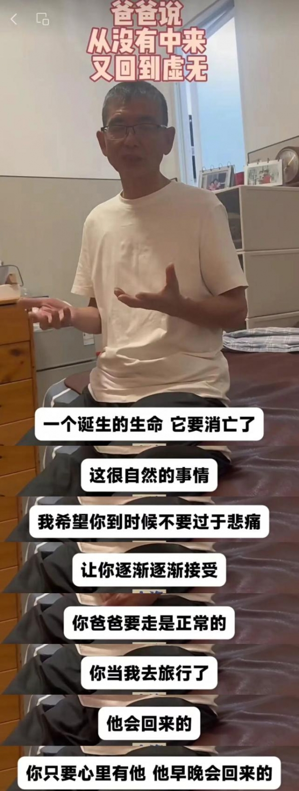 视频发出后涌来的善意浪潮,出乎她的意料。海量留言中,有人写道:"爸爸对死亡还是很害怕的,但他更害怕你伤心。"这条评论让董三白彻底"破防"。"晚上10时视频发出后,我一直哭到凌晨4时。"她说,许多经历过猝然别离的网友从中获得了慰藉与告别的力量,仿佛听到了已故亲人想说的话。