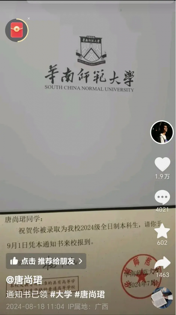 继公开宣布决定去上大学后,近日,唐尚珺晒出了华南师范的录取通知书。