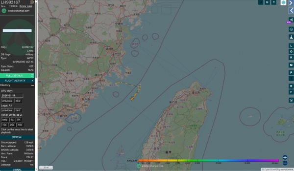 按民间航迹网站 Flightradar24 的数据来看,这两架直-10并不是偷偷摸摸绕着飞,而是在进入海峡航道区的同时,就直接打开了 ADS-B 广播式自动监视系统,把自己的识别号、位置、高度、速度、航迹统统公开挂在空中。