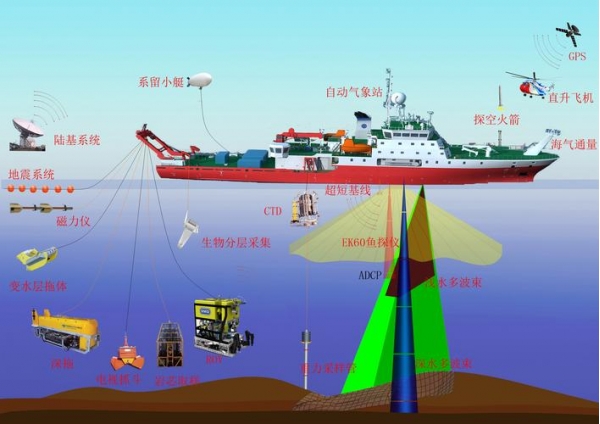 一般来说,这样的调查船会配备多波束测深系统、侧扫声呐、水下地质测绘设备、拖曳线列阵声呐、地磁探测系统,再加上一整套水文气象测量装置。