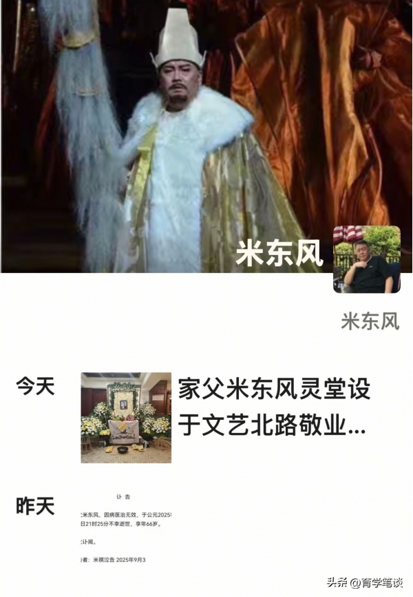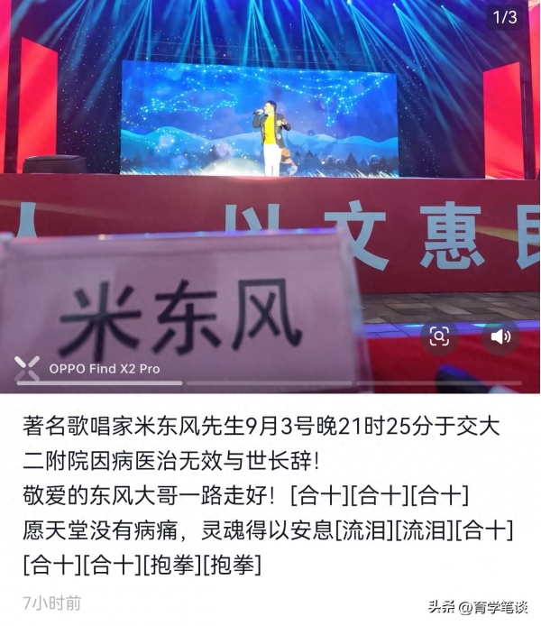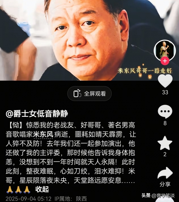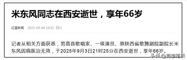 9月4日凌晨开始,网络上就有很多人在发布消息,称著名的男高音歌唱家米东风先生走了,具体时间是9月3日晚上9点多,在西安交大二附院因病医治无效去世,享年66岁。